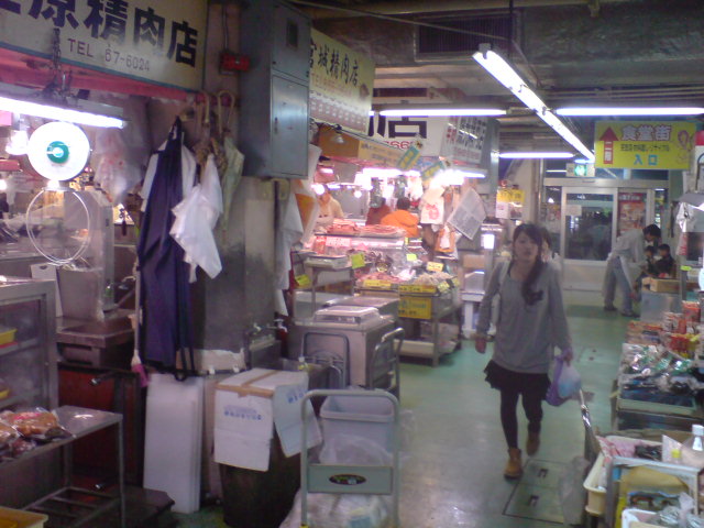 帰る日飛行機までまだ時間があったので市場に行きました。肉屋のおばあちゃんが記念写真を撮ってあげると言われ沖縄名物豚の顔の隣で3ショットしました。