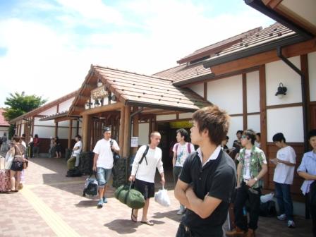 左が河口湖駅で右のレトロバスに乗ってキャンプ場に行きました。