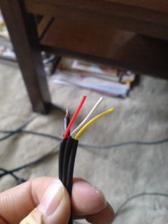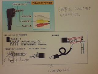 実はこの赤白黄の周りにまとめてしまいましたが、エナメル線がありました。そのエナメル線がGNDなんですけれども、それがコネクタの本線だと思ってしまい、なかなか映りませんでした(当たり前なんですけれどね・・・)。今度は大丈夫と、半田でどろどろに溶けてしまったミニピンプラグを取り替えて半田をつけなおしました(ここまでくるのに火傷しました(笑))。そして恐る恐る起動すると・・・